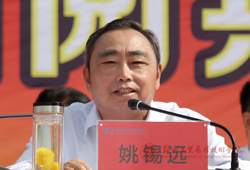 在热烈的掌声中,校理事会首席顾问姚锡远教授发表了讲话。他首先向来自全国28个省、市、区的7000余名新同学表示热烈的欢迎和诚挚的祝贺,向承担军训任务、付出心血和汗水的教官表示衷心的感谢和崇高的敬意。姚顾问指出,经过严格的军训,看到了郑工学子更加英姿飒爽,说明了大家已经抱有“雄关漫道真如铁,而今迈步从头越”的信心和勇气,为大学第一课交上了一份满意的答卷。