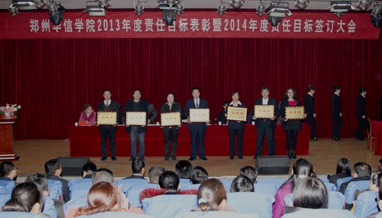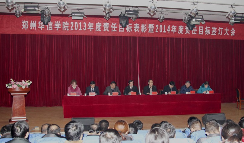 春寒料峭人心暖,龙马精神满华院。2月17日上午,我校在东校区演播厅隆重举行了2013年度责任目标表彰暨2014年度责任目标签订大会。校领导赵国运、吴廷伟、冯建业、张清华、王宝、徐朝阳、王梅、徐春华出席了大会,全校科级以上干部及师生代表参加了大会。大会由校党委书记吴廷伟同志主持。