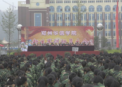 校长助理张清华隆重宣布郑州华信学院2011级新生军训工作现在开始。顿时,广场上彩花飞舞,礼炮齐鸣,至此为期15天的新生军训拉开了序幕。