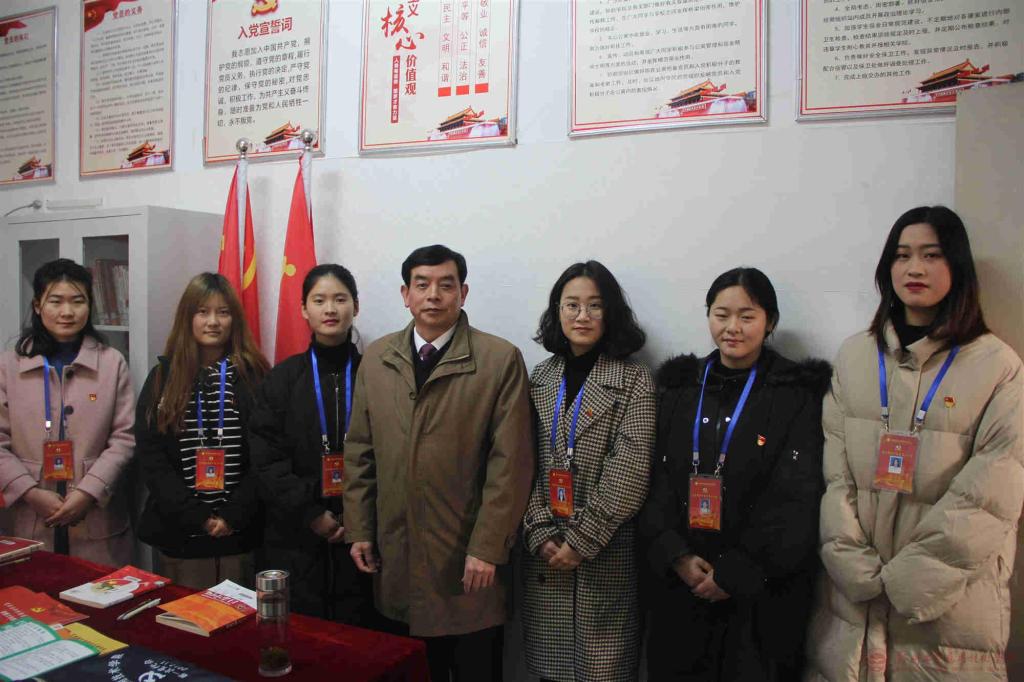 图为校党委书记吴廷伟同志在学生党员工作站与学生党员合影