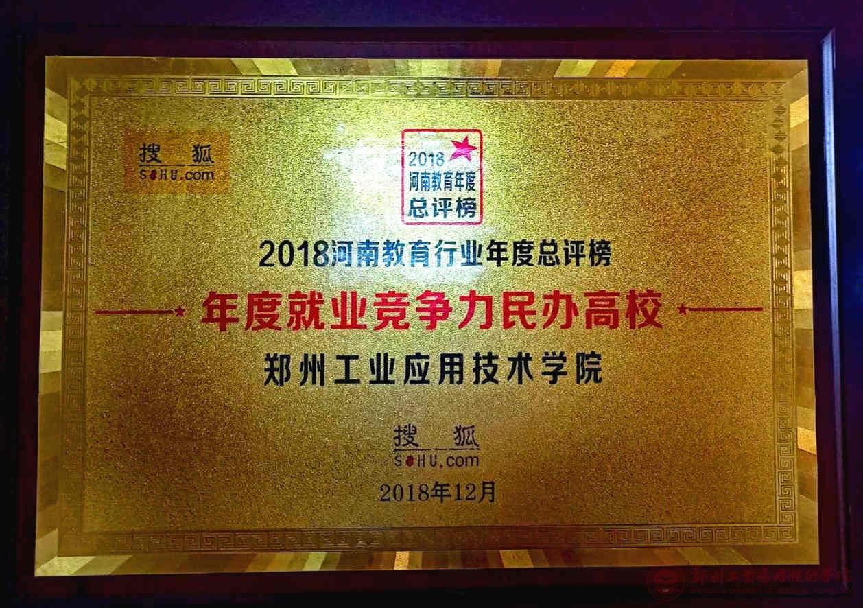 在“2018河南教育行业年度总评榜”中,郑州工业应用技术学院被评为“2018年度就业竞争力民办高校”。