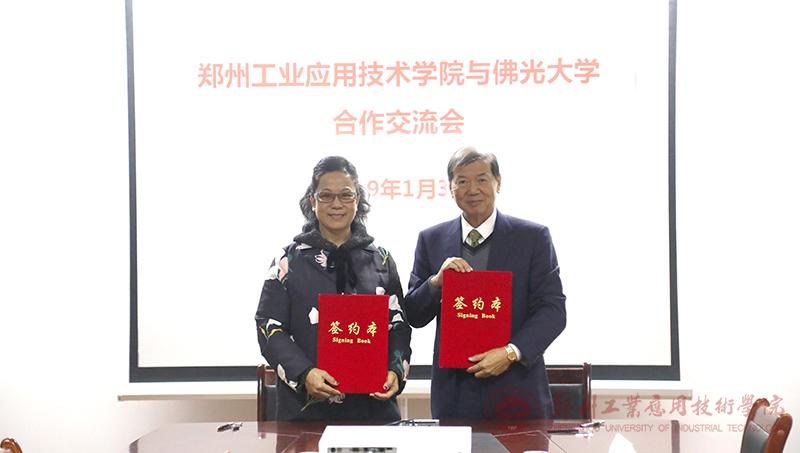 双方在会议室进行了座谈交流。郑州工业应用技术学院副校长杨新新首先对佛光大学校长杨朝祥一行表示了欢迎,并对郑工学院的基本情况进行了详细的介绍。佛光大学杨朝祥校长介绍了佛光大学的基本情况,并表达了希望两校之间开拓师生交流、科研合作、课程共享等方面有更多的合作机会和项目的意愿。双方就推进两校校际合作进行探讨、交流,达成合作共识并签订合作协议书。会上,杨朝祥校长对学校领导发出诚挚的教育回访交流邀请。