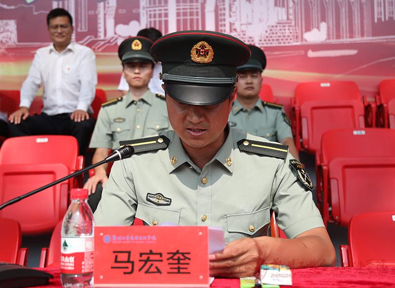 教师代表孙鸣浦教授,郑工学院大学生国防预备连连长马宏奎,学生代表医学院2018级康复治疗技术专业2班秦孝龙、音乐学院2019级学前教育专业李雨忻分别作了发言
