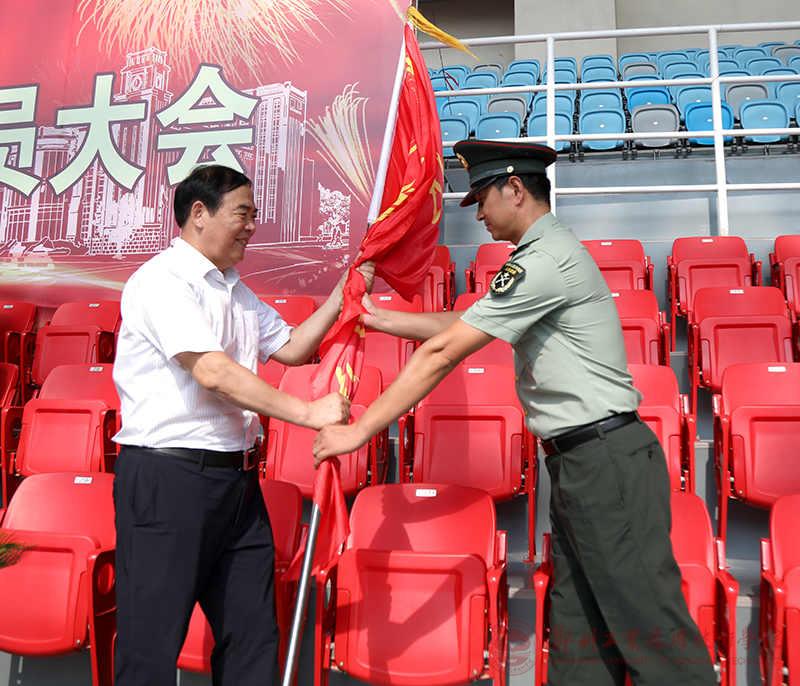 常务副校长、党委副书记刘建教授向“郑州工业应用技术学院大学生国防预备连”授旗。