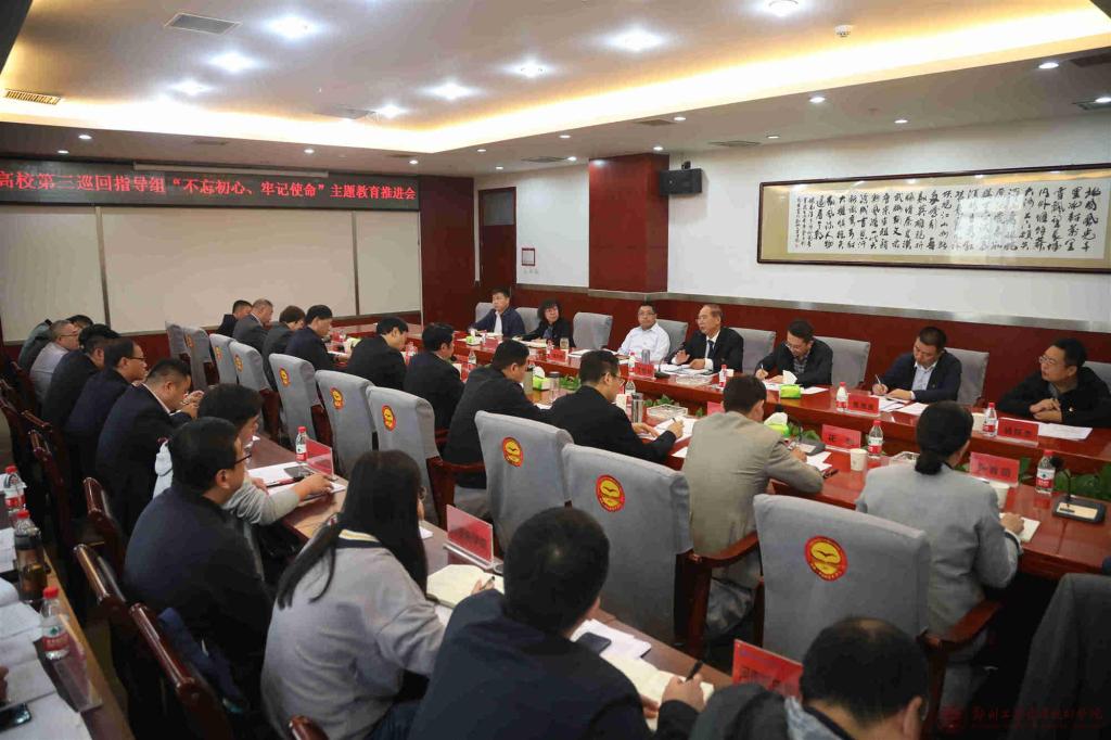 为认真贯彻落实中央、省委和高校工委的部署和安排,抓实主题教育根本任务,落实“十二字”总要求,切实推进主题教育扎实持续有效开展。10月10日上午,全省高校“不忘初心、牢记使命”主题教育第三指导组在我校召开了工作推进会。第三指导组组长丁松林,省委高校工委、省教育厅“不忘初心、牢记使命”主题教育领导小组委派杨宗辉、李志广与第三指导组成员吴元坤、贾海波、杨延杰一起出席了会议。会议由第三指导组副组长李志宏同志主持。