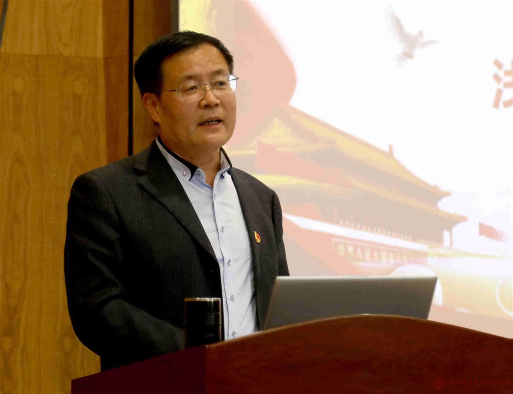 图为河南工程学院人文社会科学学院党委书记张孟东教授作报告