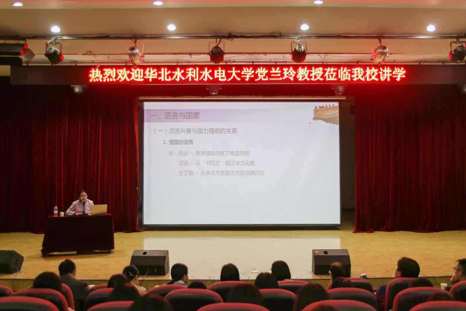 10月29日下午,华北水利水电大学外国语学院院长、硕士生导师党兰玲教授应邀来校,为外国语学院师生作了题为《语言的价值》的学术报告。报告会由外国语学院院长胡天赋教授主持。