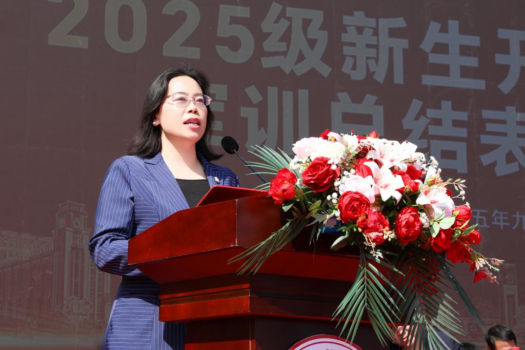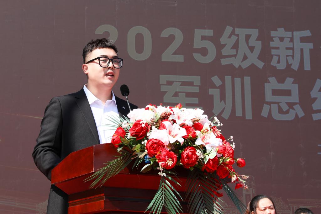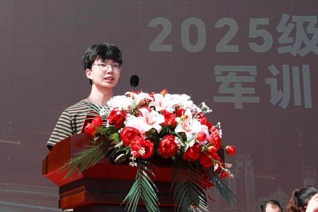 教师代表、软件学院副院长毛建景,辅导员代表、外国语学院赵弘,军训标兵代表、2025级药物制剂四班袁懋杨分别发言。