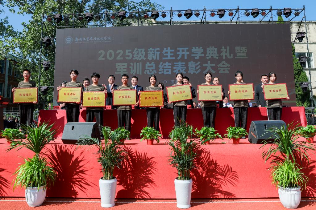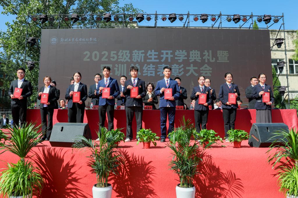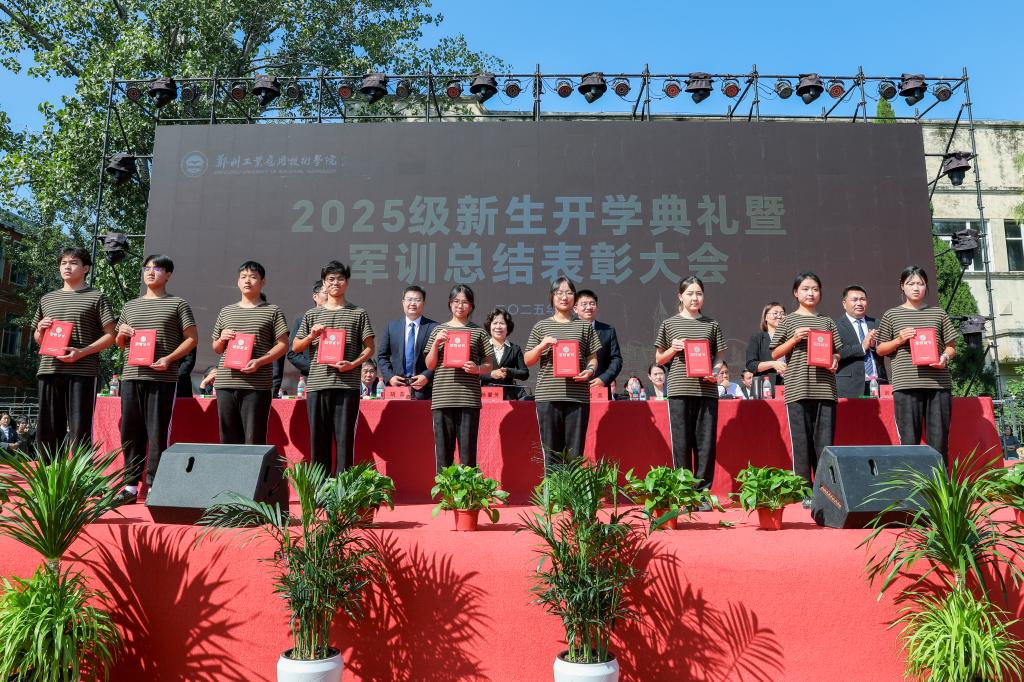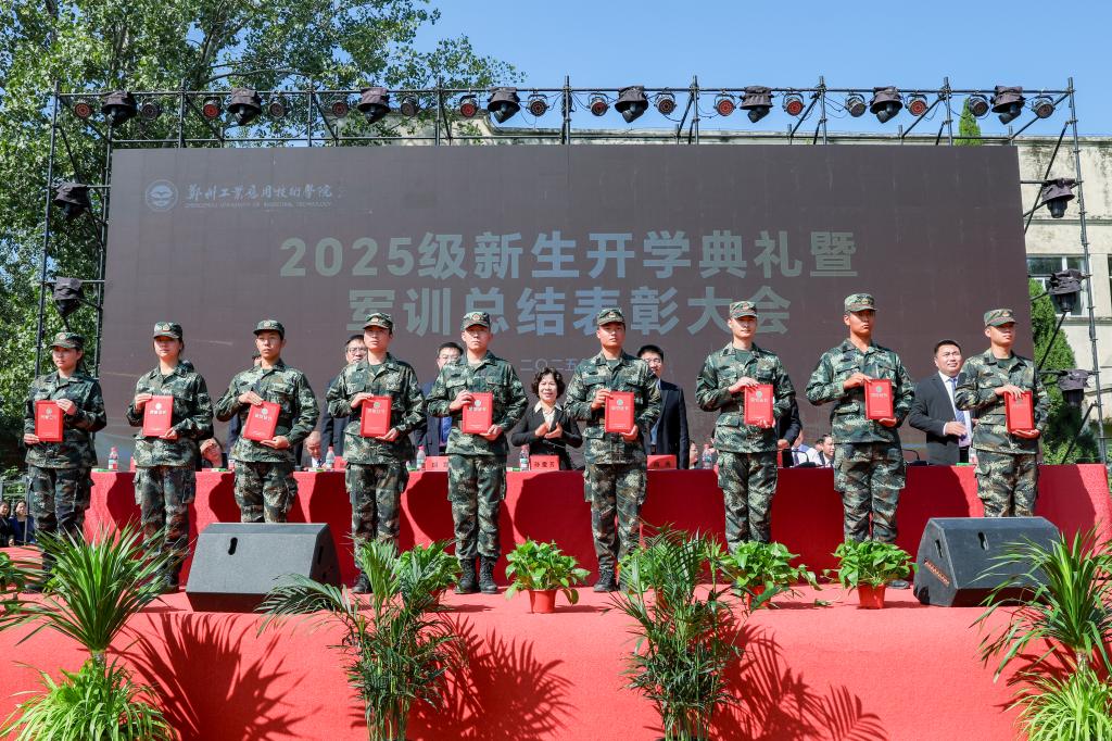 校领导胡磊、吴杰霞、周华锋、王美英、贾圣强、刘山玉、高红艳宣读表彰2025级新生军训先进集体和先进个人、2025届优秀考研学生等各项表彰决定;与会领导为获奖代表颁奖。