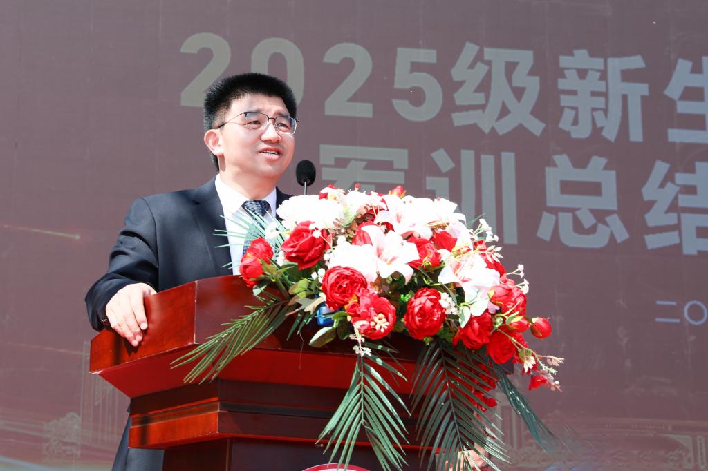 校长闫兵讲话。他代表学校向来自祖国各地的2025级新同学表示热烈的欢迎,向陪伴学生成长成才的家人、师长表示衷心的感谢,向朝夕陪伴学生的军训教官、老师以及付出辛勤劳动的学工队伍表示诚挚的谢意。闫兵寄语同学们,要胸怀大志、心系祖国、放眼世界。坚定不移听党话、跟党走,始终胸怀忧国忧民之心、爱国爱民之情,立志做有理想、敢担当、能吃苦、肯奋斗的新时代好青年。