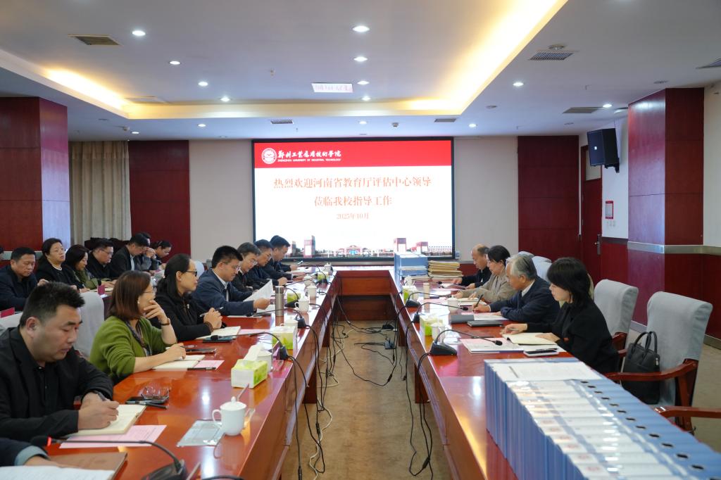 (文/陈欢 图/刘婷)10月17日,河南省高等学校教育教学评估管理服务中心主任祝玉华、常务副主任施进发、副主任卢兴光、审核评估工作部干事李颖辉一行4人来校调研考察,指导本科教育教学审核评估工作。在校校领导出席会议,相关职能处室负责人参加会议。会议由副校长贾圣强主持。